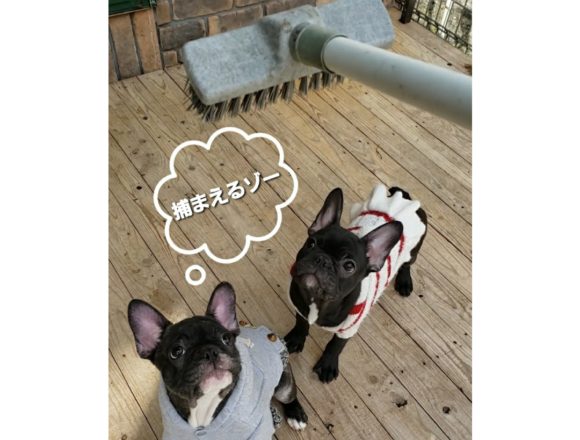 子犬たちデッキブラシに夢中です♡ひたすら追いかけ回し疲れ知らず😁お掃除出来ませ~ん😂…