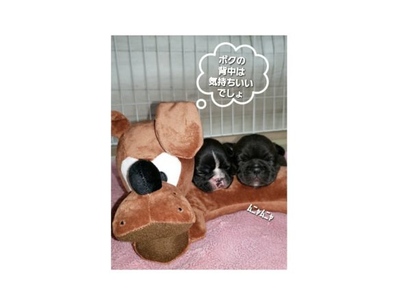 子犬たちの所にぬいぐるみを入れてあげたら、最高に可愛い状態でお昼寝していてキュン…